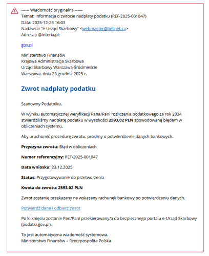 Ministerstwo Finansów i Krajowa Administracja Skarbowa nie wysyłają wiadomości e-mail, informujących o nadpłacie podatku i nakłaniających podatników do potwierdzenia danych identyfikacyjnych lub rachunku bankowego.