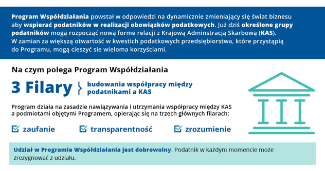 Program Współdziałania w przeciwieństwie do kontroli podatkowej nie stanowi nadzoru bezpośrednio nad prawidłowością realizacji obowiązków podatkowych. Określa zasady ścisłej i stałej współpracy między Podatnikiem oraz Szefem KAS opartej na wzajemnym zaufaniu, zrozumieniu i przejrzystości, której celem jest zapewnienie przestrzegania przez Podatnika przepisów prawa podatkowego przy wsparciu udzielonym przez Szefa KAS.